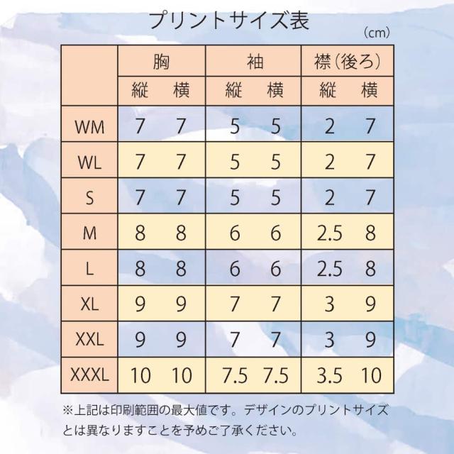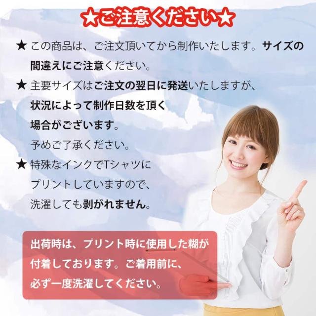 | 在庫について | サイズによっては、当店にTシャツの在庫が無い場合があります。その場合は、取り寄せてから制作・発送しますので、通常より発送が遅れます(状況にもよりますが、およそ2-7日間)。 他店舗展開しているため、ご注文頂くタイミングによっては、在庫がある商品も、注文後に欠品になる可能性がございます。 |