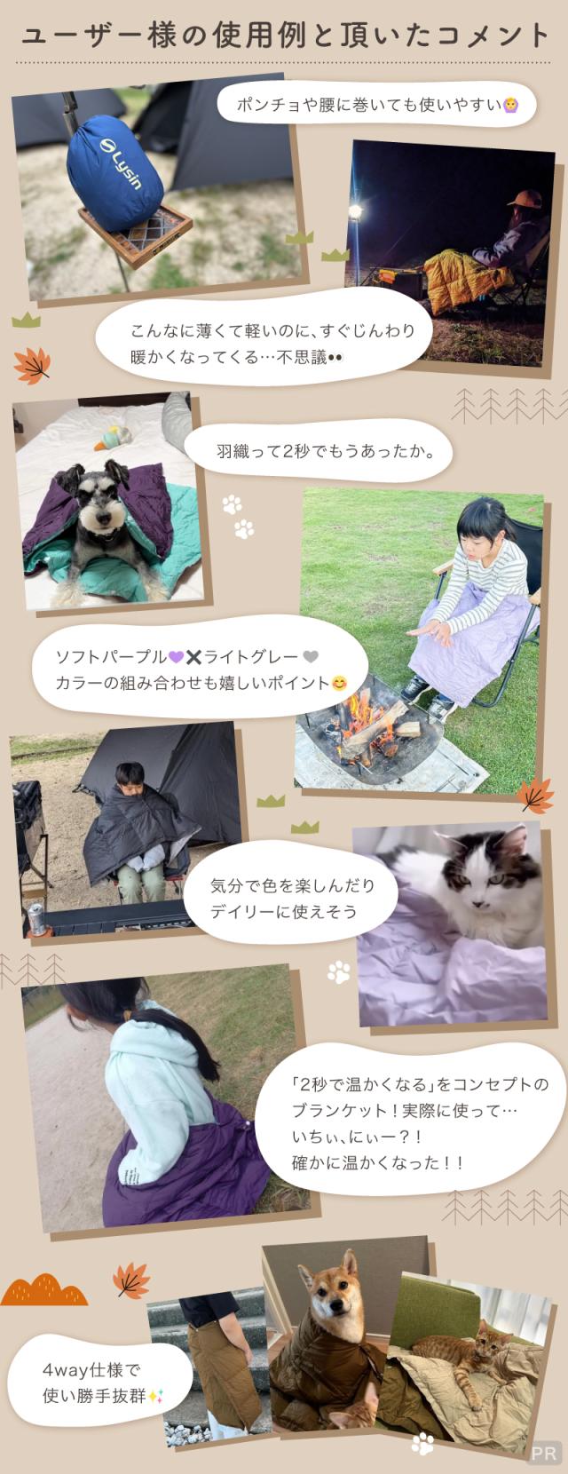 【使用場所・用途など】リビング 自宅 登山 スポーツ観戦 天体観測 毛布代わり 釣り 新幹線 飛行機 アウトドア キャンプ グランピング テント 車中泊 旅行 お昼寝 災害 防災 来客 お泊り 車 室内 室外 屋内 屋外 プレゼント