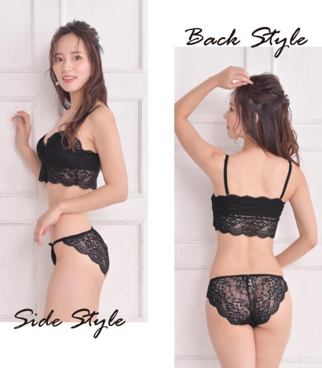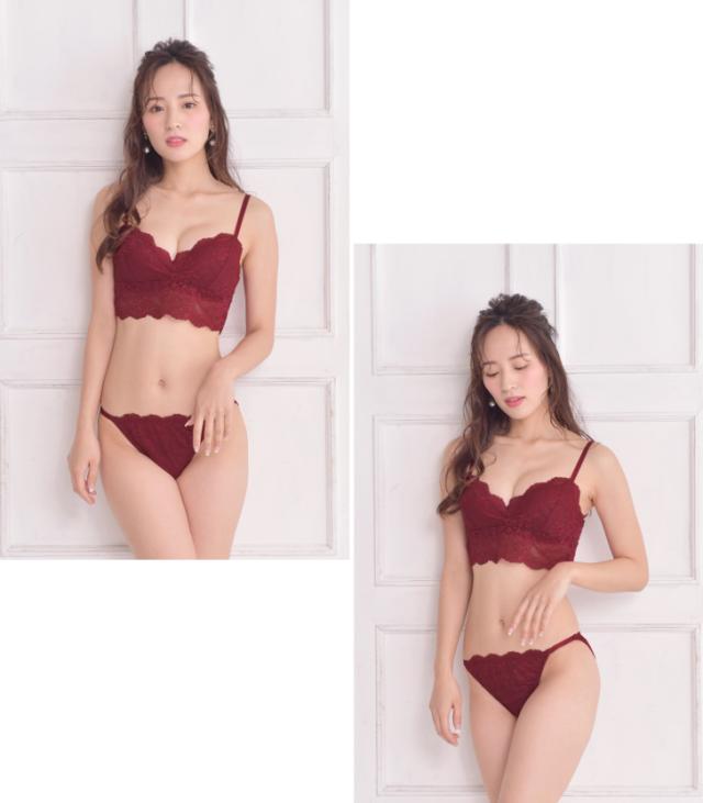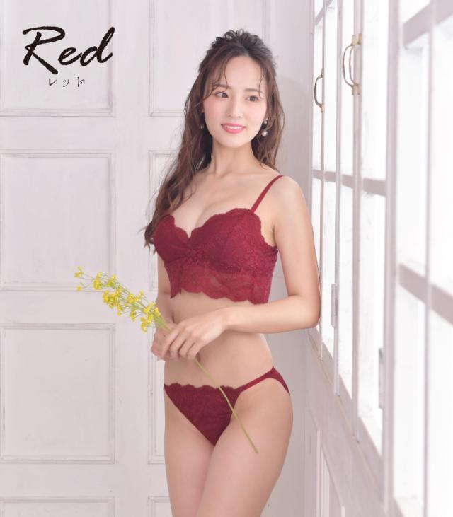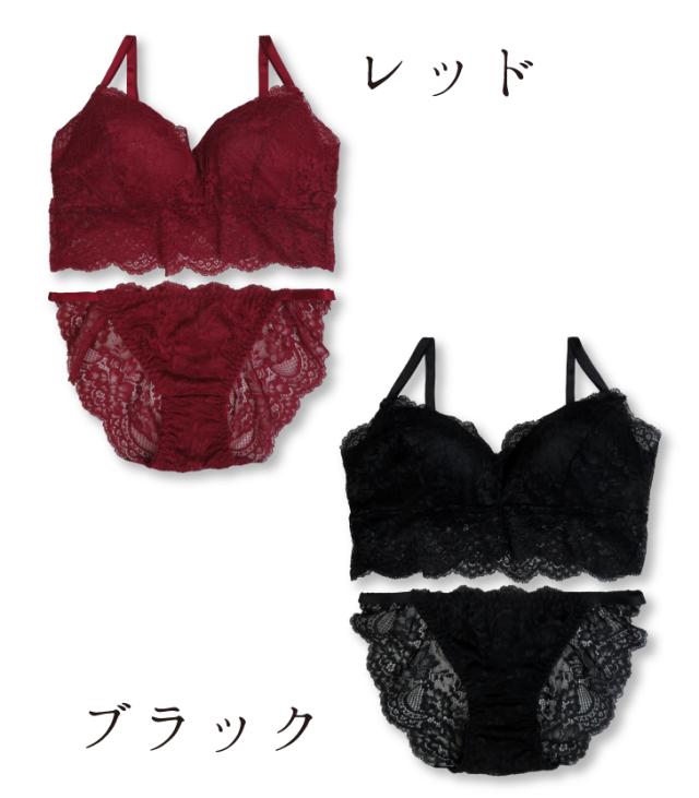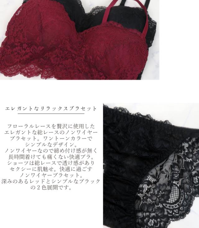 フローラルレースを贅沢に使用したエレガントな総レースのノンワイヤーブラセット。ワントーンカラーでシンプルなデザイン。ノンワイヤーなので締め付け感が無く長時間着けても痛くない快適ブラ。ショーツは総レースで透け感がありセクシーに肌魅せ。快適に過ごすノンワイヤーブラセット。深みのあるレッドとシンプルなブラックの2色展開です。