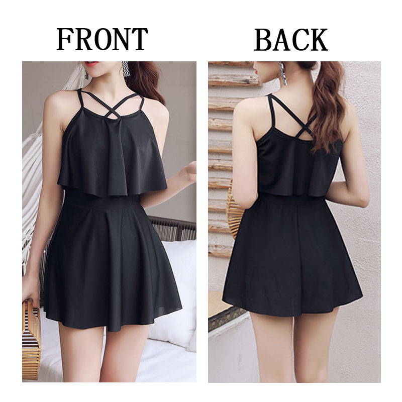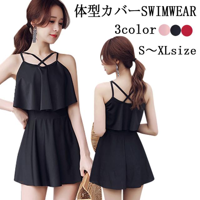 体型カバーワンピース水着 水着 ワンピース レディース オールインワン 体型カバー水着 ママ水着 20代 30代 40代 ぽっちゃり オトナ女子 大きいサイズ フリル フレアスカート 可愛い お洒落 エレガント セクシー お腹 お尻 太もも カバーアップ 黒 露出控えめ