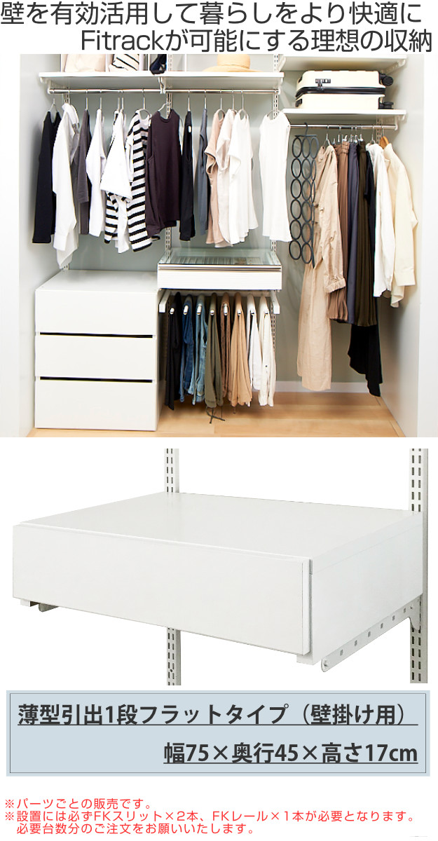 壁面収納 フィットラック 薄型 引き出し1段 フラットタイプ 幅75cm ( パーツ オプション 部品 DIY 収納 小物収納 小物入れ 引き出し 壁掛け 浮かせる収納 可動棚 オープンラック 収納ラック 有効活用 ホワイト 引出し )