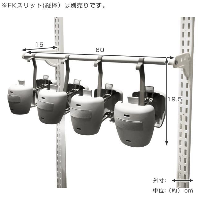 フィットラックは別売りのFKレール(横棒)とFKスリット(縦棒)の両方を壁に設置して、FKスリットにパーツを取り付けます。パーツとなるブーツハンガーの幅は【45、60、75cm】の3種類で、収納スペースに合わせて選べます。高さは2.5cm間隔で、収納物や収納場所に合わせて調整できます。