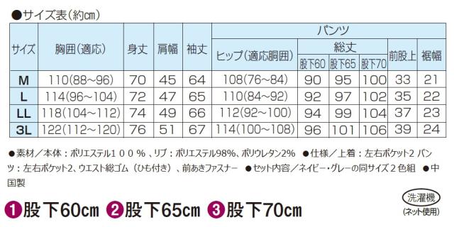 ●仕様/上着:左右ポケット2パンツ:左右ポケット2、ウエスト総ゴム(ひも付き)、前あきファスナー