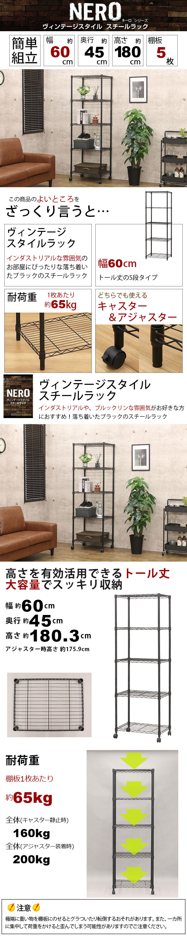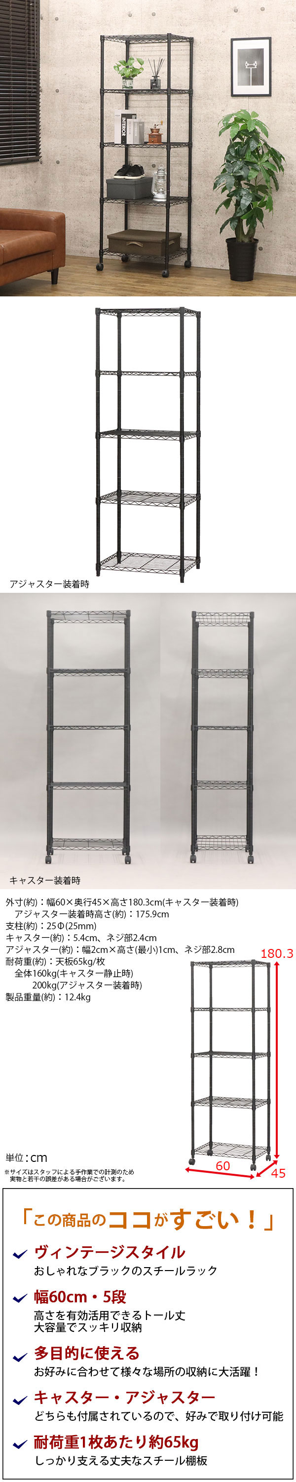スチールラック5段 おしゃれなヴィンテージ風 幅60cm 奥行45cm 高さ180cm ブラック(黒) キャスター付き アジャスター付き ブルックリンスタイル インダストリアル風 リビング テレビ台 ゲーム機 キッチン 調理家電 調理器具 引っ掛ける収納 映える収納 ゴミ箱収納 NERO-6018