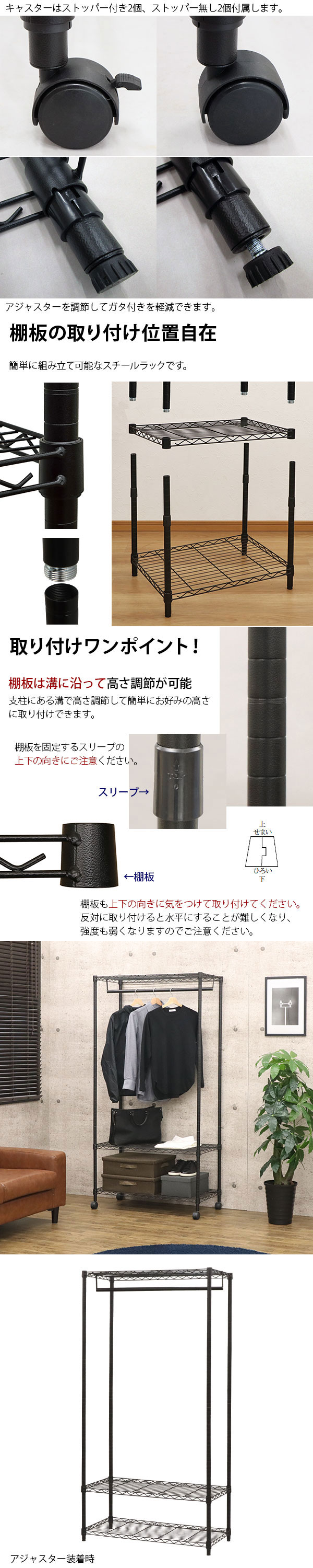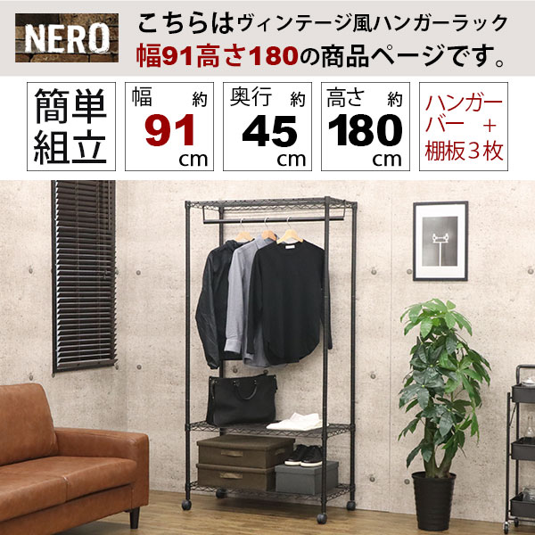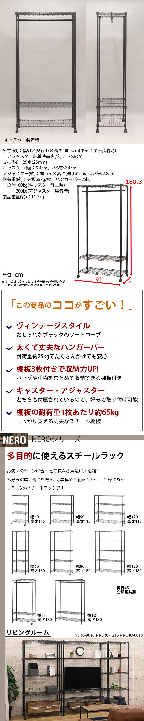 スチールハンガーラック ワードローブ おしゃれなヴィンテージ風 幅91cm 奥行45cm 高さ180cm(約90×45×180) ブラック(黒) キャスター付き アジャスター付き ブルックリンスタイル インダストリアル風 リビング キッチン 調理器具 引っ掛ける収納 映える収納 ゴミ箱収納 (約幅90cm 奥行45cm 高さ180cm) ハンガーバー付属 テレビ台 ゲーム機 TV台 テレビラック TVラック AV機器 AV収納 ディスプレイ 調理家電 炊飯器 電気ポット 電気ケトル ホットプレート ホットサンドメーカー 押し入れ収納 移動棚板 多目的ラック フリーラック 玄関収納 リビング収納 キッチン収納 引っ掛けて収納 衣類収納 洋服収納 ごみ箱収納 おもちゃ収納 クローゼット すきま収納 可動棚板3枚 シンプル かわいい 簡単組立 NERO-900