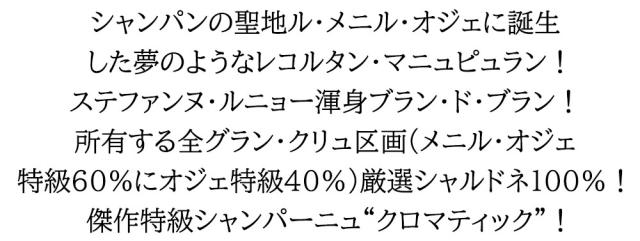 シャンパンの聖地ル・メニル・オジェに誕生した夢のようなレコルタン・マニュピュラン!ステファンヌ・ルニョー渾身ブラン・ド・ブラン!所有する全グラン・クリュ区画(メニル・オジェ特級60%にオジェ特級40%)厳選シャルドネ100%!傑作特級シャンパーニュ“クロマティック”!