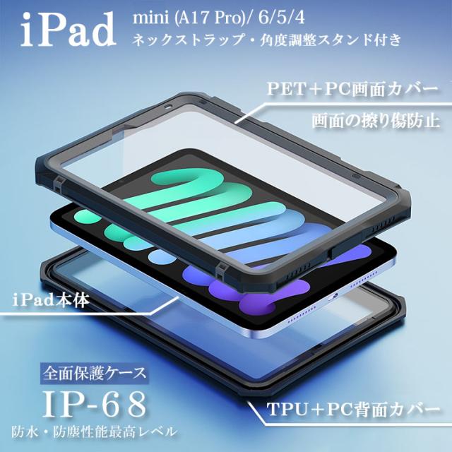 完全防水仕様 iPad ケース 防水ケース iPad mini A17 Pro mini7 6 5 第7世代 第6世代 2021年 ipad mini6 mini5 mini4 第5世代 第4世代 7.9インチ アイパッドミニ7 ミニ6 ミニ5 ミニ4 防塵 耐衝撃性 全面保護 アイパッド防水カバー IP68 業務用 雨 お風呂 落下防止