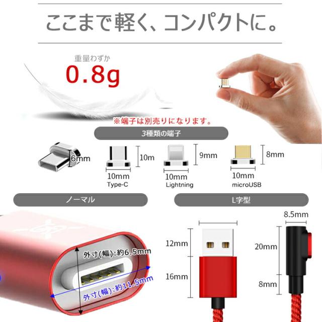 ※注意※ この商品ページにて販売のケーブルと端子は専用設計です。 他の所のケーブルと端子には合いませんのでご注意ください。 当商品は3.0A電流に対応のケーブルです。当商品で充電を行ったからといって急速(高速)充電になるものではなく、接続するアダプターの出力電流により急速(高速)充電が可能となります。 ■ 端子とケーブル本体を磁石で着脱できるケーブルにして、コネクターを充電口に近づけると磁力で簡単に接続されます。 片手でケーブルの先端を近づけるだけなので、荷物を持っているときや運転中、急ぎの際も瞬時に充電開始。 ■1本3役こなす優秀さ!自宅でも外出先でも1本あれば対応可能。 ケーブルの3つの頭は「iPhone」「Micro USB」「Type-C」です。 ※ご覧いただいているページは、ケーブル単品(2メートル)販売ページです。専用端子は別売りとなっております。 ■3A高速充電に対応 通常の充電ケーブルと比べてももっと早い速度で充電できます!充電時間を大きく縮小。 ■埋め込み型タッチピン 一般のマグネット接続タイプのケーブルに比べ、各コネクター(マグネット端子差し込み部)とケーブルの優れた接続を実現。 電流のロスを防ぎ、より高速充電を可能にしたのはもちろん使用寿命延長にも役立つ。 ■LEDライトの点灯で通電中は一目瞭然!ケーブルを抜く際には、軽い力で引き寄せるだけで、 ケーブル本体を引っぱってしまう心配もない。 ■USB端子とマグネット端子部には丈夫且つ軽量で放熱効果も優れている航空アルミ合金を使用。 ■優れた耐引力、耐衝撃性能。捻じれ・断線に強く、絡みにくい。 ■ナイロンの特徴であるゴム製よりしなやかで手触りが良く、汚れや変色に強い。 ■内蔵スマートチップで電流を賢くコントロールし、過電流、過電圧、過充電、過熱を防止。 |