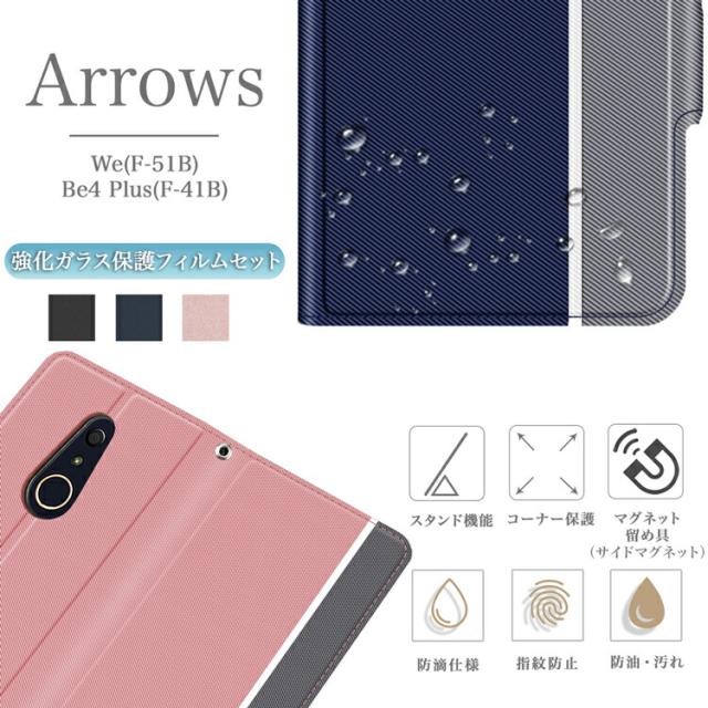 ガラスフィルムセット Arrows We F-51B FCG01 A101FC Be4 Plus F-41B アローズ ドコモ エーユー ケース docomo au スマートフォンカバー 指紋 汚れ防止 カード収納ポケット付 手帳型 ストラップ付き PUレザー TPUインナーカバー シンプル おしゃれ スマホケース 軽量 薄型