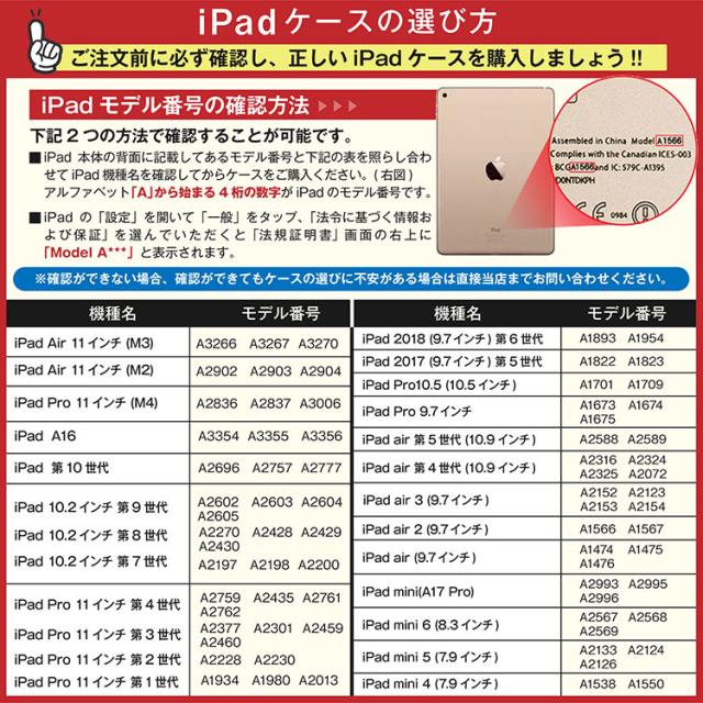※機種のお間違いにご注意ください。 ご不明の場合は、当店までお問い合わせください。 ●iPad 10.9 第10世代(10.9インチ、2022年10月発売) ・モデル番号:A2696、A2757、A2777 ●iPad 10.2 第9/第8/第7世代(10.2インチ、2021年/2020年/2019年発売、※同じケースを使用) ・第9世代モデル番号:A2602、A2603、A2604、A2605 ・第8世代モデル番号:A2270、A2428、A2429、A2430 ・第7世代モデル番号:A2197、A2198、A2200 ●iPad 9.7 第6/第5世代(9.7インチ 、2018年/2017年発売、※同じケースを使用) ※商品選択肢名は「iPad 2017/2018」です。 ・モデル番号:A1822、A1823、A1893、A1954 ●iPad Pro 11 インチ (M4) /2024年発売 ・モデル番号:A2836、A2837、A3006 ●iPad Pro 11 第4/第3/第2世代 (11インチ、2022年/2021年/2020年発売、※同じケースを使用) ・第4世代モデル番号:A2759、A2435、A2761、A2762 ・第3世代モデル番号:A2377、A2459 ・第2世代モデル番号:A2228、A2068、A2230 ●iPad Air 11 インチ (M2) /2024年発売 ・モデル番号:A2902、2903、A2904 ●iPad air 第5/第4世代(10.9インチ、2022年/2020年発売、※同じケースを使用) ※商品選択肢名は「Air 5/Air 4 兼用」です。 ・第5世代モデル番号:A2588、A2589、A2591 ・第4世代モデル番号:A2316、A2324、 A2072、A2325 ●iPad air 3 / iPad Pro 10.5(10.5インチ、2019年/2017年発売、※同じケースを使用) ・Air 3モデル番号:A2152、A2123、A2153 ・Pro 10.5モデル番号:A1701、A1709 ●iPad mini 6(8.3インチ、2021年発売) ・モデル番号:A2567、A2568、A2569 ●iPad mini 5 / iPad mini 4(7.9インチ、2019年/2015年発売、※同じケースを使用) ・mini 5モデル番号:A2124、A2126、A2133 ・mini 4モデル番号:A1538、A1550 |
