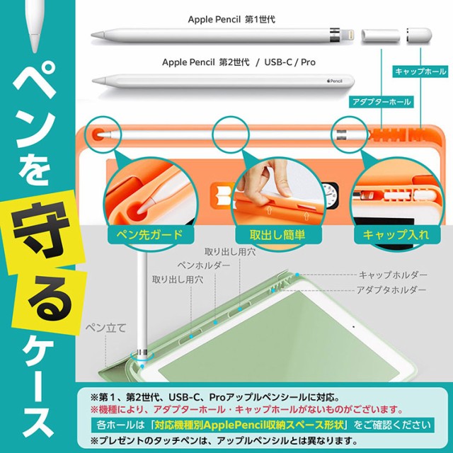 ■iPad本来のの薄さと重さを損なわないよう薄型・軽量設計ケース!衝撃吸収に優れたソフトシリコン素材を使い、iPadを優しく守ってくれます。 ■フロントカバーに内蔵された複数のマグネットにより、安定したスタンド保持。タイピングや動画視聴などiPadを立てて使用でき、とても便利。 ■カメラ撮影や音量調節・充電などはケースを閉じたままでも使用できるように設計、使い勝手も抜群です。 ■すべてのケースオートスリープ機能付きです。 ■ケースの着脱が簡単な取り出し用穴を搭載。 ■iPadケースでありながらApple Pencilが入るポケットを搭載。破損や紛失を防ぎ一緒に仕舞っておけばなくしたり忘れたりもしません。 ■ケースに付けたままアップルペンシルのワイヤレス充電、指紋認証も可能です。 ※詳細は画像説明をご確認下さい。 |