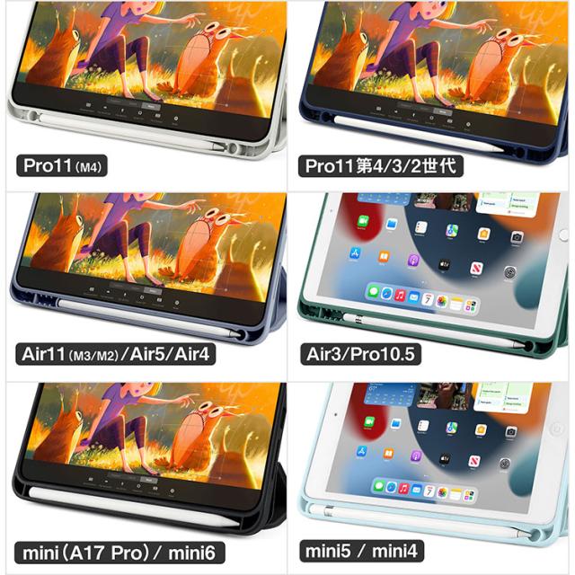 【材質】 ・バックケース:ソフトシリコン ・フロントカバー:PUレザー 【ケースサイズと重量】 ●iPad 10.9 第10世代 ・サイズ:(約)縦25.2×横19.5×厚1.5cm ・重量:(約)330g ●iPad 10.2 第9/第8/第7世代 ・サイズ:(約)縦25.5×横19.2×厚1.5cm ・重量:(約)320g ●iPad 9.7 第6/第5世代(選択肢名:iPad 2017/2018) ・サイズ:(約)縦24.6×横18.6×厚1.1cm ・重量:(約)300g ●iPad Pro 11 インチ (M4) /2024年発売 ・サイズ:(約)縦25.8×横19.2×厚1.5cm ・重量:(約)320g ●iPad Pro 11 第4/第3/第2世代 ・サイズ:(約)縦25.8×横19.2×厚1.5cm ・重量:(約)320g ●iPad Air 11 インチ (M2) /2024年発売 ・サイズ:(約)縦25.8×横19.2×厚1.5cm ・重量:(約)315g ●iPad air 第5/第4世代(選択肢名:Air 5/Air 4 兼用) ・サイズ:(約)縦25.8×横19.2×厚1.5cm ・重量:(約)315g ●iPad air 3 / iPad Pro 10.5 ・サイズ:(約)縦25.5×横19.2×厚1.5cm ・重量:(約)331g ※上記両機種は同じケースを使用します。 ●iPad mini 6 ・サイズ:(約)縦20×横15×厚1.4cm ・重量:(約)205g ●iPad mini 5 / iPad mini 4 ・サイズ:(約)縦20.8×横15.2×厚1.4cm ・重量:(約)220g ※上記両機種は同じケースを使用します。 ■機能:オートスリープ機能付 |