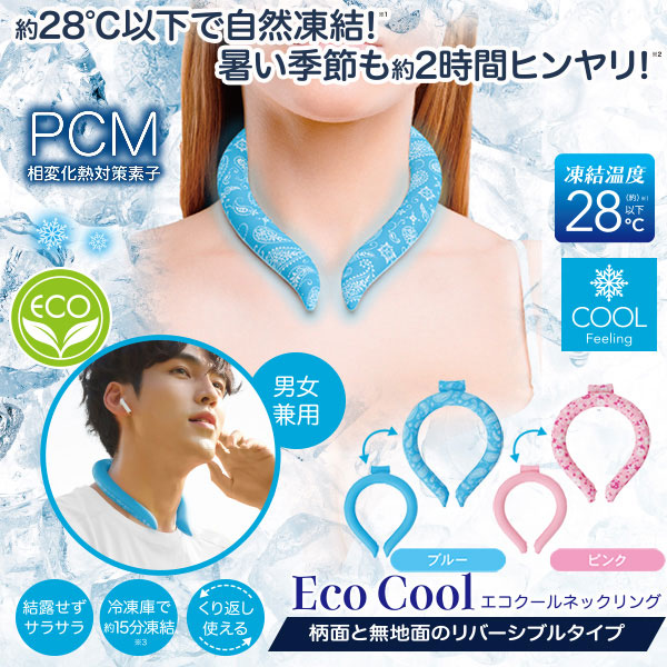 【メール便(ネコポス)対応】【2,200円以上でメール便 送料無料】冷凍庫などで簡単凍結!約28度以下で自然凍結!暑い季節も約2時間ヒンヤリ!適正温度を保持する宇宙服に使われている相変化材料PCMを使ったひんやりネックリング。冷凍庫などで15分、冷蔵庫、冷水で20分で簡単凍結!首を冷やして涼しさアップ!クーラーなどの効いた28℃以下のお部屋であれば冷蔵庫に入れなくても放置していれば凍結します。柄×無地のリバーシブルで気分、TPOに合わせてご使用ください。