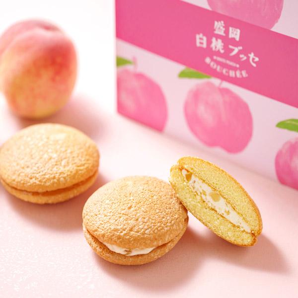 軽い食感のブッセ生地に 桃の香り付けしたクリームとシロップ漬けの白桃果肉をサンドしました。