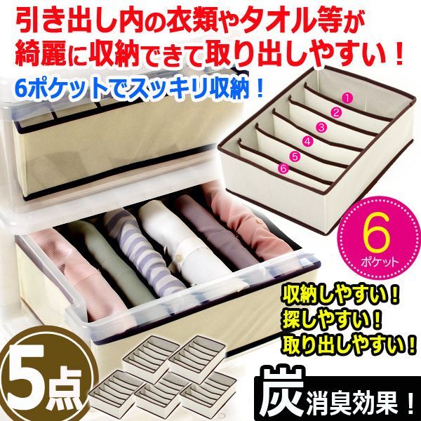 炭消臭!引き出しスッキリ整頓仕切り収納ボックス6ポケット[5点] (通気性 汚れ カビ 生活臭 炭シート 衣類 タオル 取り出しやすい)