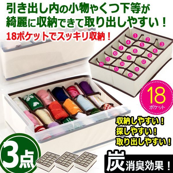 炭消臭!引き出しスッキリ整頓仕切り収納ボックス18ポケット[3点] ( 通気性 汚れ カビ 生活臭 炭シート ハンカチ 小物 靴下)