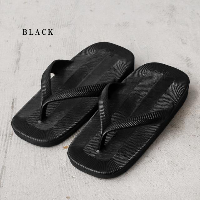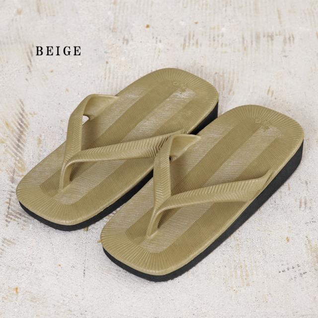 和の雰囲気を感じる雪駄ようなビーチサンダルです。アッパーは射出成型式で鼻緒とフットベットが一体になっており、ソールはビーチサンダルなどで使用される発砲EVAを使用していますので水辺でも問題なく使用が出来ます。底には波型のソールパターンが施され滑りにくい仕様になっています。雪駄の特徴である草木を編んだような模様は奈良のサンダル工場で過去に廃版になった金型を発掘し復刻させています。MADE IN JAPAN