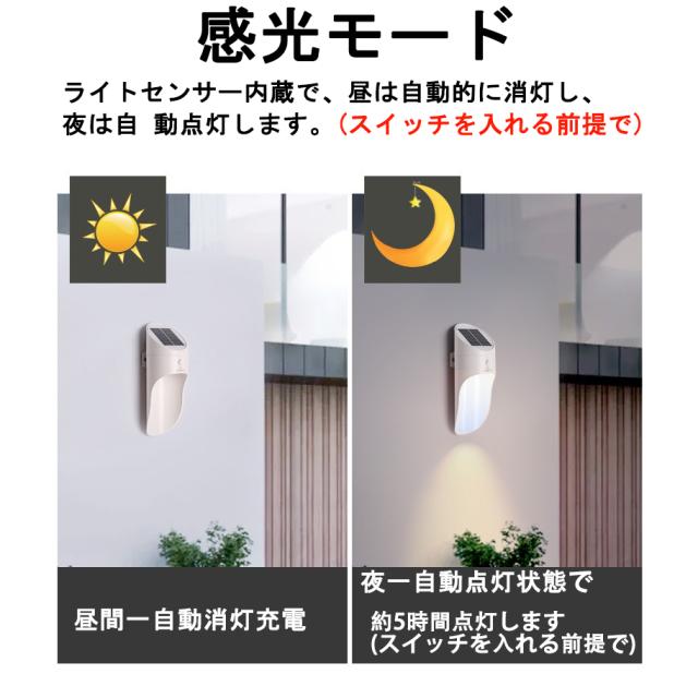 運動感知センサーが内蔵され、夜や暗くなると、自動弱光点灯モードとなり、人や動物は約5メートル以内の動きが感知でき、強光点灯モードに変わり、動きがなくなると弱光点灯モードになります。
