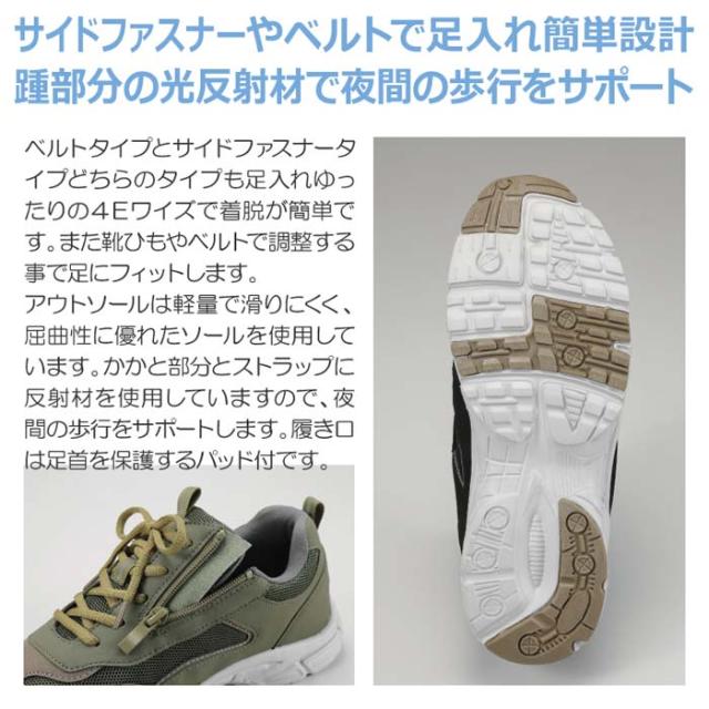 ベルトタイプとサイドファスナータイプどちらのタイプも足入れゆったりの4Eワイズで