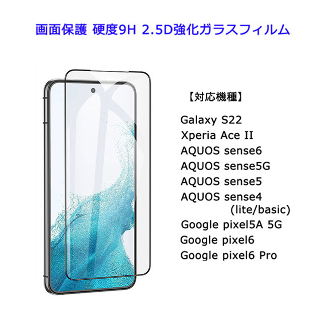 2.5D強化ガラスフィルム 画面保護フィルム Galaxy S22 Xperia Ace II AQUOS sense5G sense6 sense4 lite basic Google pixel6 pixel6Pro pixel5A 硬度9H 0.33mm スマホ 液晶 保護ガラス SCG13 SC-51C SO-41B SH-54B SHG05 SH-53A SHG03 SH-41A