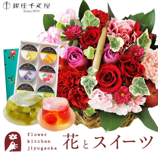花とスイーツのセット ミニョンバスケット【ピンクレッド】+【銀座千疋屋】銀座ゼリー6個入りセット プレゼント 誕生日 記念日 お祝い花 即日発送 あすつく メッセージカード FKAASW