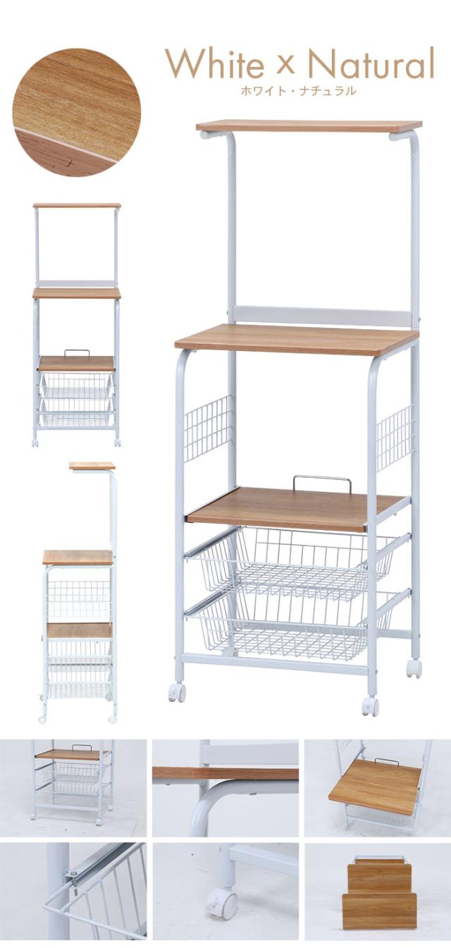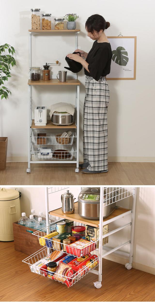 | 木目調とスチールの組み合わせがおしゃれなレンジワゴン。 高さを利用した場所をとらないスリムな設計。 使いたい時にすぐ手が届くオープン収納。 家電用品を置いたり、作業台としてもお使いいただけます。 中間の棚(約幅49×奥行40cm)は前に引き出すことができ、炊飯器などを置くのに便利。 スライド式のバスケットが2杯ついているので、たっぷり収納できます。 キャスター付きなので移動もラクラク。 移動させないときはキャスターについているストッパーで固定(2か所)できます。 |