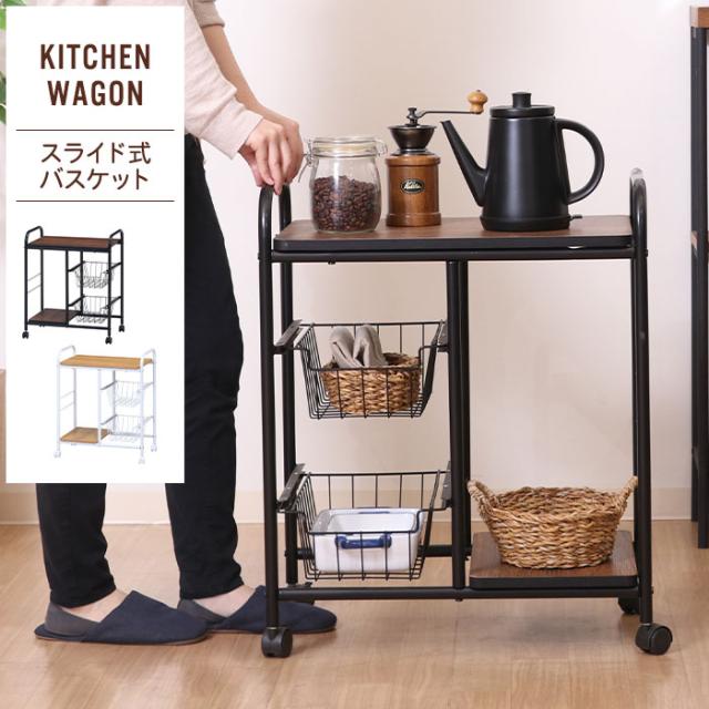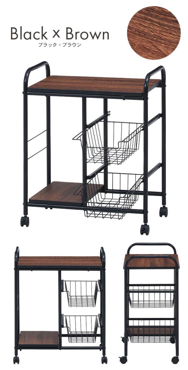 | 木目調とスチールの組み合わせがおしゃれなキッチンワゴン。 使いたい時にすぐ手が届くオープン収納。 フラットな天板スペースは幅40×奥行35.5cmで、家電用品を置いたり、作業スペースとしてもお使いいただけます。 スライド式のバスケットが2杯ついているので、たっぷり収納できます。 片側は高さ46.5cmの収納スペースで、背の高いボトルや高さのあるお酒のビンなども収納OK。 キャスター付きなので移動もラクラク。 移動させないときはキャスターについているストッパーで固定(2か所)できます。 |