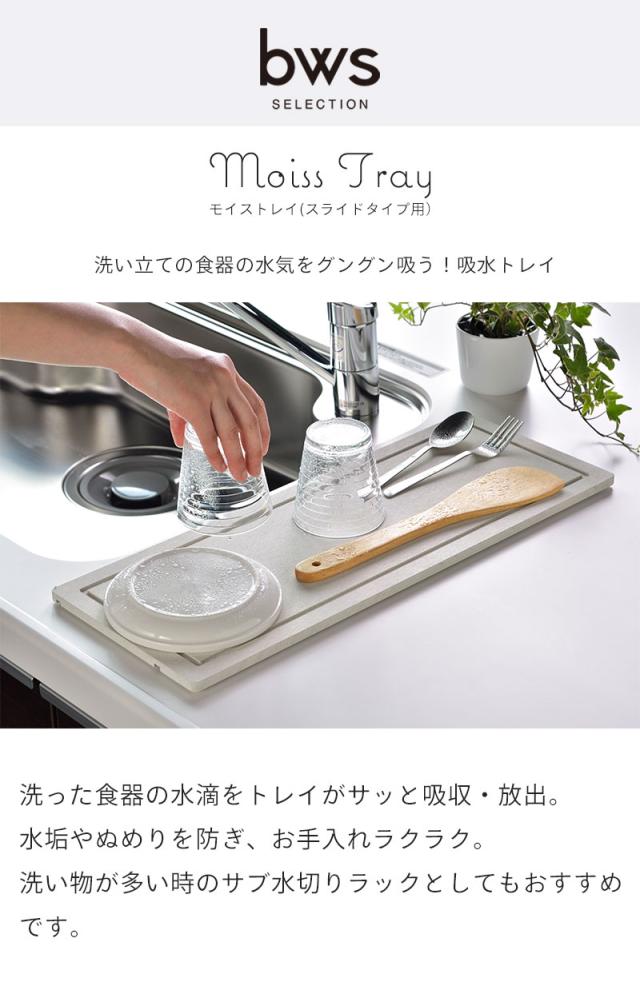 洗い物から落ちた水滴を吸収し、徐々に空気中に放出してくれる日本製の吸収トレイ。