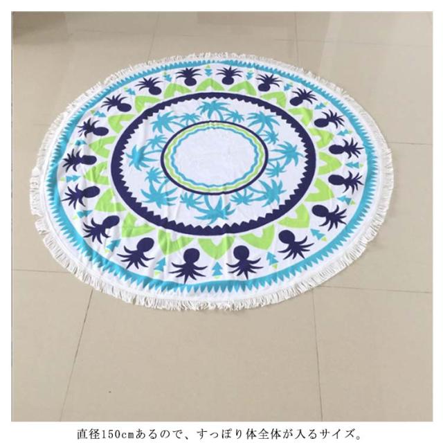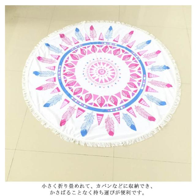 | 海・プールやピクニック等アウトドアイベントにオススメのラウンドビーチマット♪ 直径150cmあるので、すっぽり体全体が入るサイズ。 小さく折り畳めれて、カバンなどに収納でき、かさばることなく持ち運びが便利です。 ビーチで羽織ってもよし!ひいてもよし!ご自宅のラグマットとしてもよし!ただのバスタオルに差をつける直径150cmのビッグサイズ! バリエーションも豊富だから今年の海はお気に入りの1枚と♪ | |