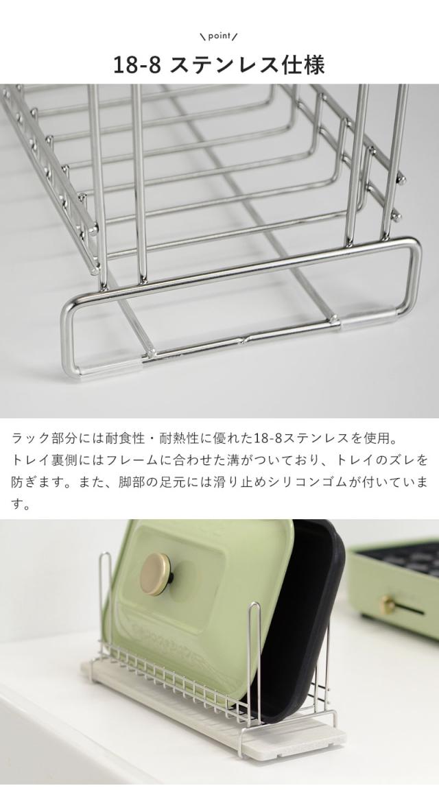 | 新潟県の燕三条製の水切りラックと日本製の吸水素材モイスを組み合わせました。 コンパクトサイズの水切りラックと吸水トレイの組み合わせで水捨て不要。 奥行約12cmの超スリム型なので限られたスペースを有効活用できます。 吸水・速乾機能があるモイストレイが水滴を吸収し、徐々に空気中に放出してくれるので、お手入れラクラク! キッチンのちょっとした洗い物にオススメ。 洗った食器の水滴をトレイがサッと吸収・放出して、トレイに水が溜まらないので水捨ての手間がなく、水垢やぬめりを防ぎます。 カップやマグボトル、包丁・ベットボトル、ミニフライパンや小瓶など、4つの角がついているのでアイデア次第でいろいろな物を乾かせます。 ゴム製の滑り止め付きで、置いた場所を傷めません。 ★モイスとは 吸水素材モイスは、天然素材を主成分とするインテリア建材です。 バーミキュライトや珪砂を主成分とした、天然鉱物から作られる日本製の建材です。 珪藻土同様、水分を吸収し吐き出す性質から、近年バスマットや水切りプレートとしても人気の素材です。 吸水が早く、表面の手触りがサラっとしているのも特徴です。 |