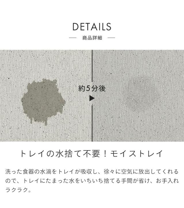 | 新潟県の燕三条製の水切りラックと日本製の吸水素材モイスを組み合わせました。 洗い物の量によってサイズを変えられる伸縮タイプの水切りラックと吸水トレイの組み合わせで水捨て不要。 グラスホルダーと箸立てもお好きな位置に移動できるので、使いやすさに合わせて置き方をアレンジできます。 吸水・速乾機能があるモイストレイが水滴を吸収し、徐々に空気中に放出してくれるので、お手入れラクラク! 奥が深く、手前が浅い構造になっているのでたっぷり収納で、洗い物を出し入れしやすくなっています。 カゴはお皿が立てやすいワイヤー間隔で、洗い物をスムーズに置けます。洗い物の量によってスライド式で調整可能です。 3〜4人分の食器をスッキリ綺麗に収納でき、幅約56cmのロングサイズなのでシンクを跨いでも設置できます。 ゴム製の滑り止め付きで、置いた場所を傷めません。 ★モイスとは 吸水素材モイスは、天然素材を主成分とするインテリア建材です。 バーミキュライトや珪砂を主成分とした、天然鉱物から作られる日本製の建材です。 珪藻土同様、水分を吸収し吐き出す性質から、近年バスマットや水切りプレートとしても人気の素材です。 吸水が早く、表面の手触りがサラっとしているのも特徴です。 |