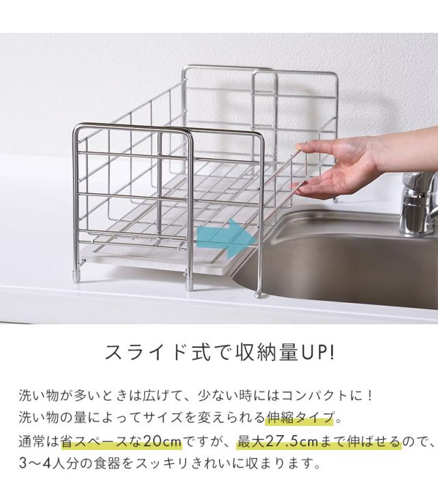 水切りラック伸縮 スライド 水切りかご 水切り ラック スリム 奥行20 かご バスケット トレー付き 珪藻土 けいそうど 幅56.3 奥行20.0〜27.5 高さ21cm ステンレス シンク横 シンク上 シルバー 大容量 省スペース 日本製 国産 燕三条 箸立て 新生活 一人暮らし おしゃれ