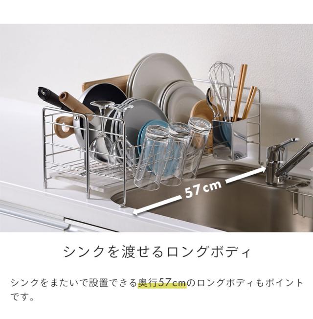 3〜4人分の食器をスッキリ綺麗に収納でき、幅約56cmのロングサイズなのでシンクを跨いでも設置できます。