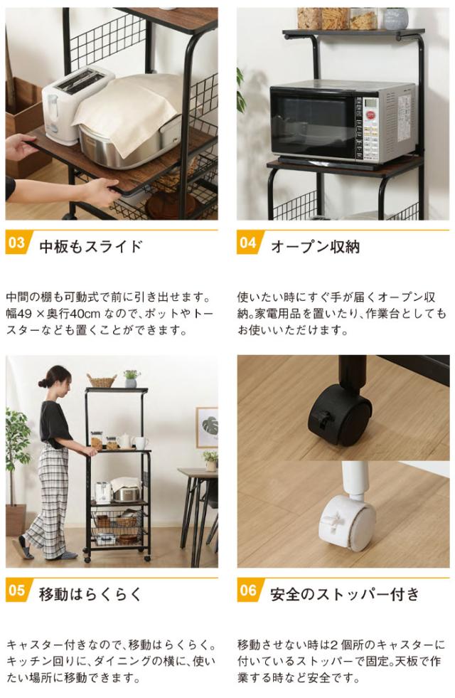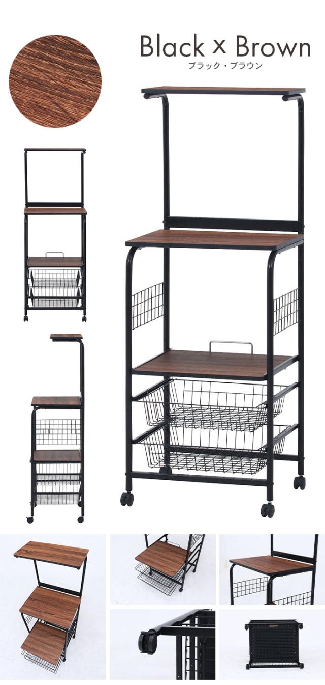 | 木目調とスチールの組み合わせがおしゃれなレンジワゴン。 高さを利用した場所をとらないスリムな設計。 使いたい時にすぐ手が届くオープン収納。 家電用品を置いたり、作業台としてもお使いいただけます。 中間の棚(約幅49×奥行40cm)は前に引き出すことができ、炊飯器などを置くのに便利。 スライド式のバスケットが2杯ついているので、たっぷり収納できます。 キャスター付きなので移動もラクラク。 移動させないときはキャスターについているストッパーで固定(2か所)できます。 |