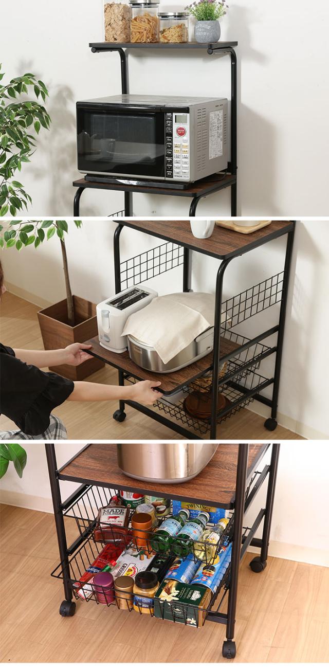 木目調とスチールの組み合わせがおしゃれなレンジワゴン。