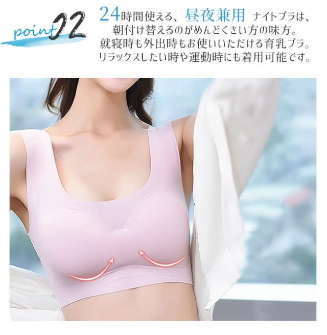 ●縫い目がないので肌あたりがよく、接触冷感の素材がひんやり気持ちよく、さらっとした肌触りが暑い日にぴったりです。●24時間使える、昼夜兼用 ナイトブラは、朝付け替えるのがめんどくさい方の味方。就寝時も外出時もお使いいただける育乳ブラ。リラックスしたい時や運動時にも着用可能です。●パットの取り外し可能