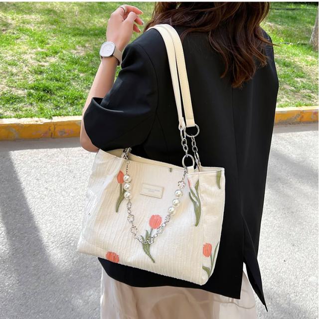 トートバッグ レディース バッグ ショルダーバッグ ハンドバッグ 花柄 キャンバス チェーンストラップ パールストラップ 大人 きれいめ カジュアル 大容量 通勤 通学