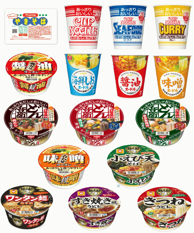 店頭で見かけないが、美味しいカップ麺もピックアップしました。日清食品では、あっさり味カップヌードル、あっさり味どん兵衛、ペヨングソース焼きそば、味のスナオシでは、焼きそば、カレー南蛮そばも。大黒食品縦型の醤油・味噌・海鮮塩味ラーメン。東洋水産では、?之助からワンタンメン。小エビ天そば、きつねうどん、すき焼きうどん。12種でお届けします。小腹が減った!お夜食に。おむすびのお供に。大変便利なセットです。色んな味が楽しめるセット。賞味期限は数か月ありますので安心してください。