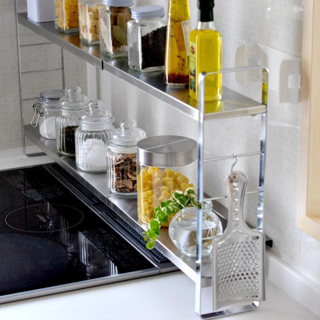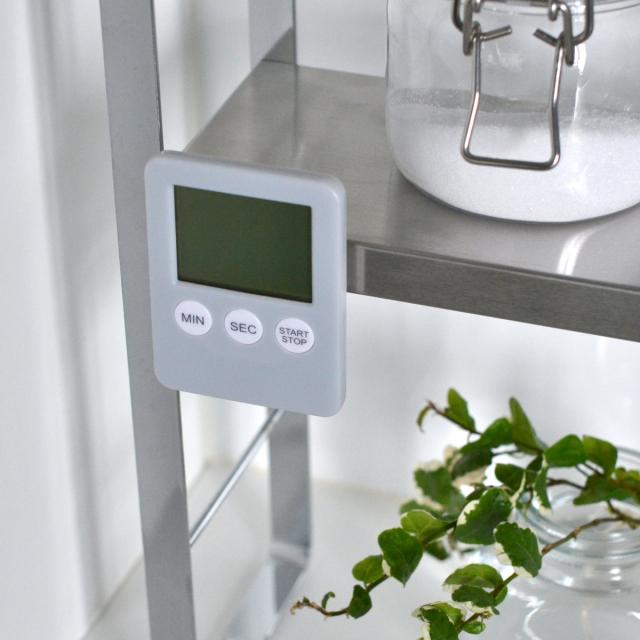 フレーム部はスチール製です。マグネットがくっつくので、タイマーやマグネット収納グッズを取り付けられます。また棚板には錆びに強い18-8ステンレスを使用しています。丈夫な素材なので長くお使いいただけます。