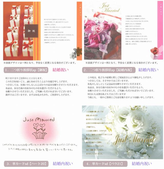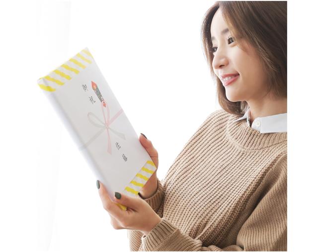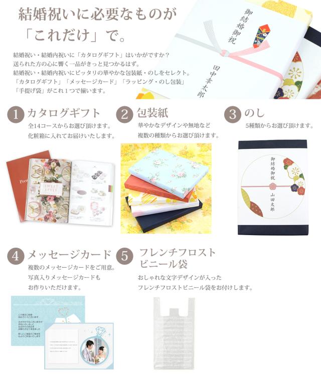 結婚祝いの際に必要な「カタログギフト」「メッセージカード」「ラッピング・のし包装」「手提げ袋」がこれ1つで揃います。