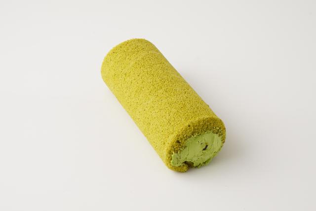 宇治の抹茶パウダーを生地にたっぷり練りこみふんわりと焼き上げた鮮やかな抹茶スポンジ生地の中に軽い口当たりの生クリームにも宇治抹茶を加えホイップしたクリームに大納言あずきをトッピングした抹茶づくしのロールケーキです。
