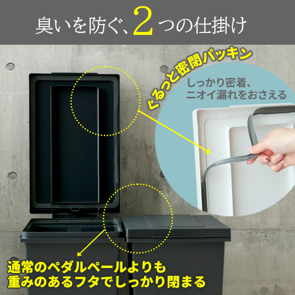 ゴミのニオイ漏れを防ぐ、密閉タイプのペダル式ごみ箱2個セット。