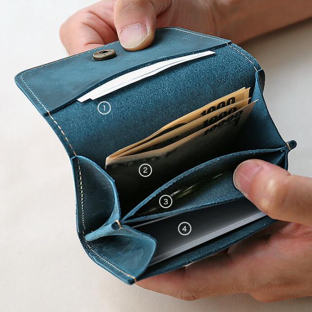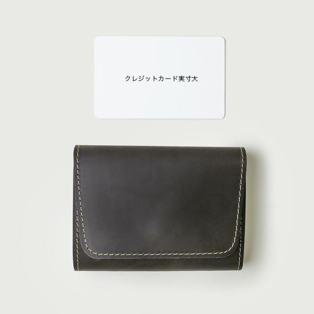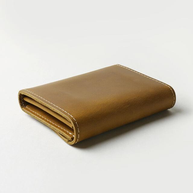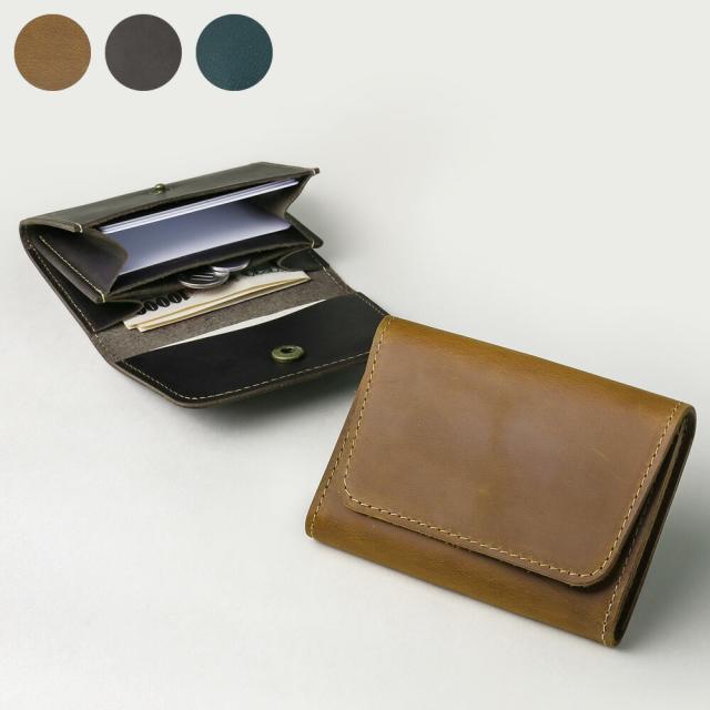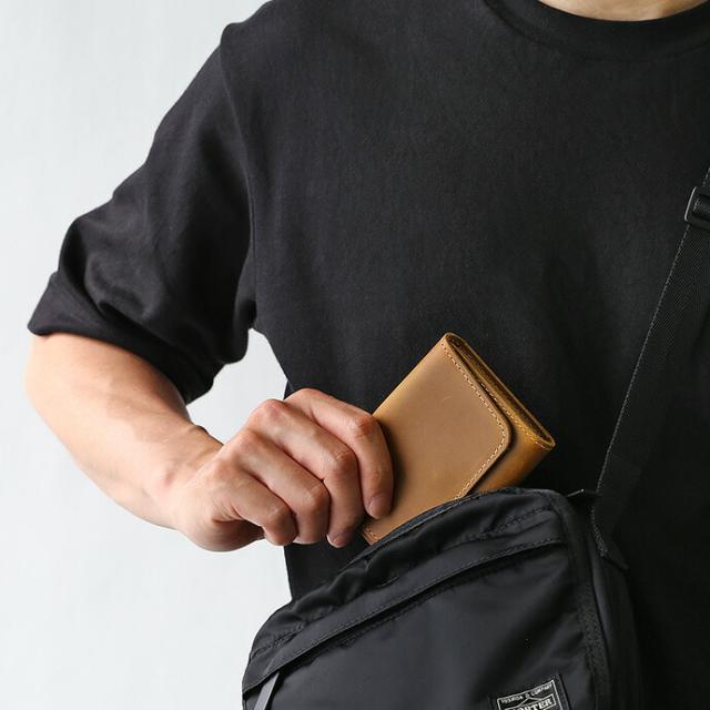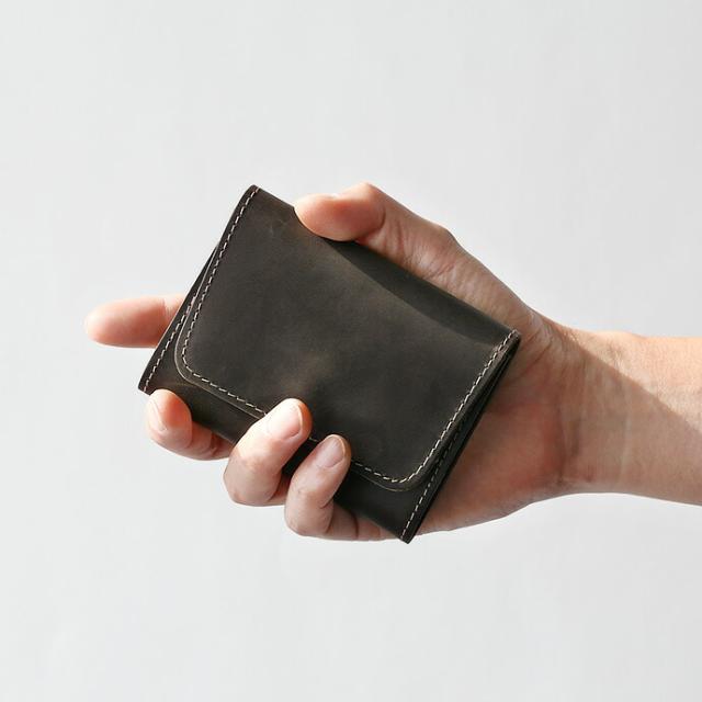 キャッシュレスな時代に選びたい、シンプルさが嬉しい本革フラップ式ミニ財布です。革にはクレイジーホースレザーを使用。正真正銘の牛革で、この革が鞍作りによく利用されたことが名前の由来です。使い込むことでツヤのある質感に変化するため、エイジング(経年変化)を楽しむこともできます。中央にコインポケットがあり、その両横にお札やカードが入るフリーポケットが2つ、フラップにもレシートを挟めるポケットが付いています。男性の手のひらほどのサイズ感でウエストバッグやショルダーバッグにも相性抜群です。