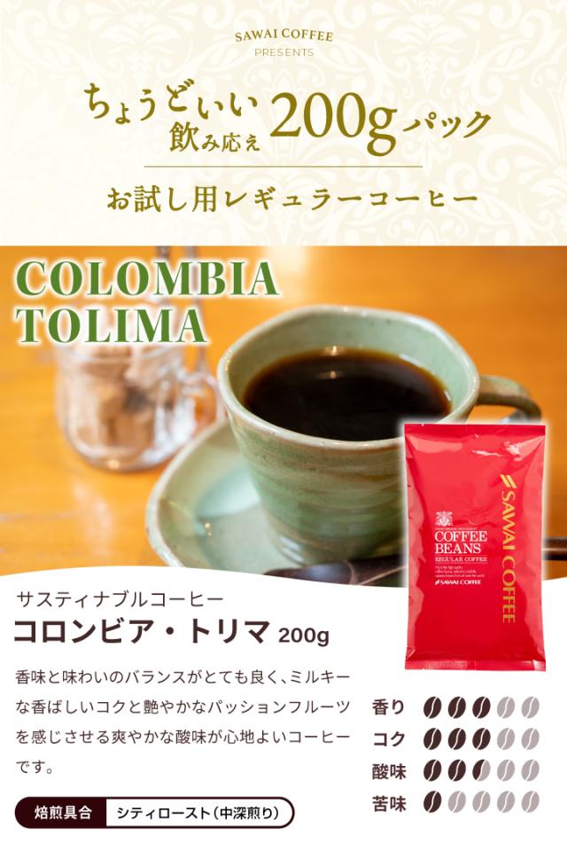 【澤井珈琲】1000円ポッキリ 送料無料 メール便 200g サスティナブルなコーヒー コロンビア トリマ コーヒー コーヒー豆 珈琲 珈琲豆 お試し コーヒー粉 粉 澤井珈琲 ちょうどいいサイズの 20杯分 ポイント消化