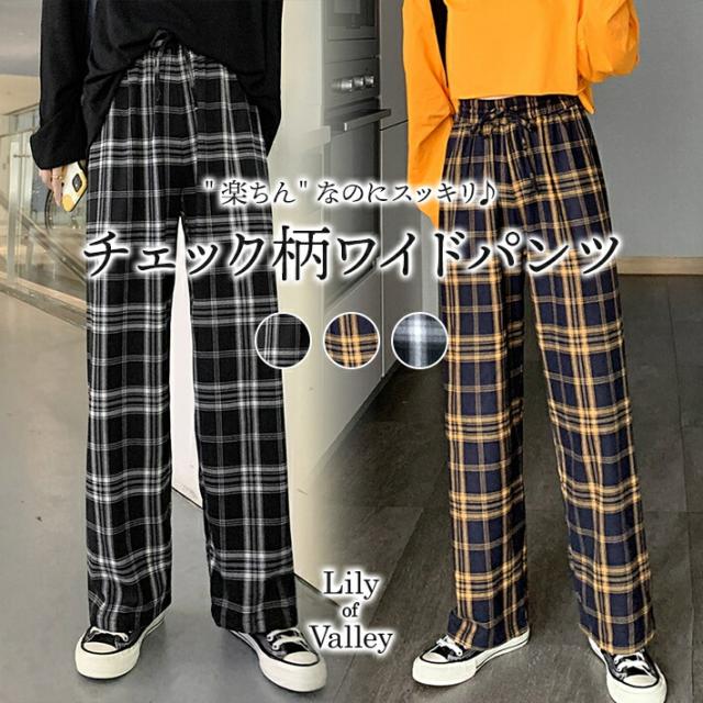 店内SALE!! チェック柄 セミ ワイドパンツ カジュアル ゆったり ボトムス ふんわり ウエストゴム / レディース チェック 柄 パンツ ワイド 森ガール 上品 ウエストリボン ストレートパンツ ロング丈 大人可愛い フレアパンツ 黄色 黒 ブラック イエロー 秋 冬 秋冬 春