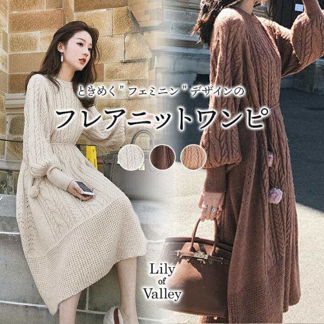 送料無料&即納★ ポンポン ファー オーバーサイズ ケーブル ニット フレア ワンピース ロング 長袖 / レディース ロングワンピース ミモレ丈ワンピース ボリュームスリーブ セーター ミモレ丈 ケーブルニット ゆったり 秋 冬 春 茶色 ブラウン ベージュ キナリ 秋冬 秋 冬