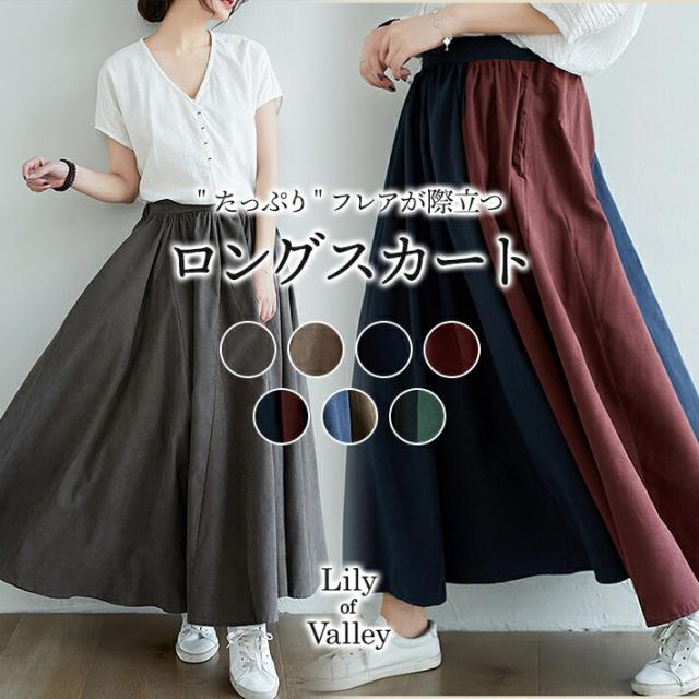 送料無料&即納★ ウエストゴム ボリューム フレア ロングスカート Aライン ふんわり カジュアル レディース / スカート ボトムス マキシ ロング丈 ミモレ 無地 ゆったり 大人可愛い 春夏 秋冬 紺 黒 赤 緑 茶色 グレー チャコール ブラック ネイビー レッド グリーン