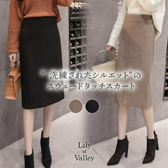 送料無料&即納★ スウェード タッチ スリット ペンシル スカート ミディ丈 ひざ下 タイト ポケット 上品 / レディース ボトムス ひざ丈 膝丈 膝下 ペンシル 冬 秋 春 秋冬 ハイウエスト ウール 大きいサイズ きれいめ タイトスカート 無地 フォーマル 黒 ブラック ベージュ
