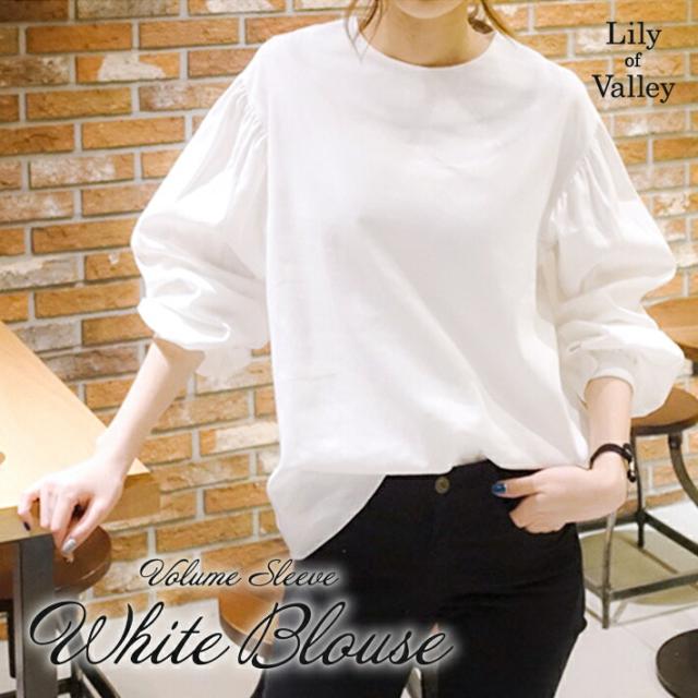 送料無料&即納★ ボリューム スリーブ ホワイト 無地 ブラウス 長袖 上品 可愛い ふんわり プルオーバー 白 / レディース トップス シャツ ゆったり バルーン袖 バルーンスリーブ ボリューム袖 フレア 春 冬 夏 秋 大きいサイズ オフィスカジュアル シンプル きれいめ 無地