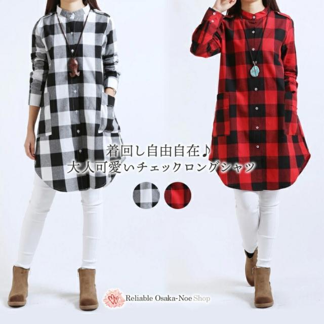 ★送料無料★着回し自由自在♪大人可愛いチェックロングシャツ/ 長袖 ひざ丈 膝丈 ゆったり ロング チュニック ワンピース 秋 春 30代 40代 黒 赤 大きい おおきい サイズ きれいめ